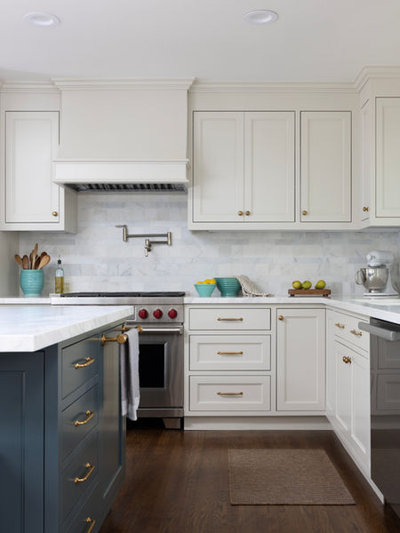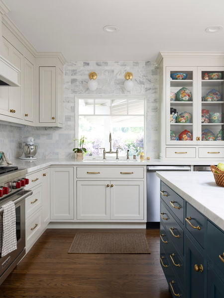 We kept the original footprint of this kitchen but gave it a whole new look—layered, personal, and full of color. The cooktop was swapped for a range, and a secondary wall oven added extra functionality. Custom cabinetry, including glass fronts and open shelves, makes room to showcase the client’s vibrant pottery collection, which inspired both the deep blue-green island and the custom counter stools. What used to be a too-small island is now perfect for prepping, gathering, and entertaining. We also redesigned the adjacent family room built-in to better suit the space and bring everything into balance.